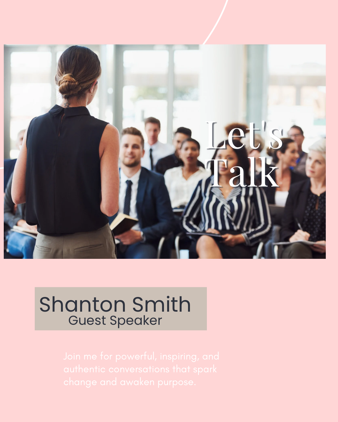 Shanton doesn’t speak at people — she speaks to the places they don’t talk about.Raised through adoption, shaped by loss, betrayal, trauma, and survival, Shanton learnedfirsthand what it means to feel unseen, unheard, and unprotected. Through her journey ofhealing, faith, and self-discovery, she emerged with a voice designed to help others reclaimtheirs.